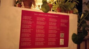 Gerade deshalb braucht es Menschen mit neuen, alternativen, nachhaltigen und sozialen Ideen. Daher darf das Tanztürchen freudig verkünden, dass dieses Gedicht in auffälligem Beerenton und riesengroß im Café Cosmo hängt.